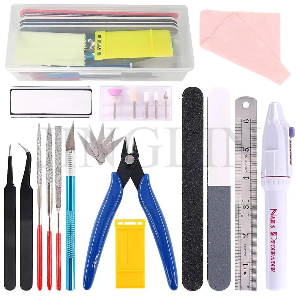 - Kit 4: A 21-piece professional model tool set with blue pliers, 2 screwdrivers, 5 static tweezers, 5 diamond files, 1 blue carving knife, 5 blades, a 15cm stainless steel ruler, 2 polishing files, 1 yellow model disassembly plate, 1 double-sided polishing block, 1 glasses cloth, and a sturdy plastic box.