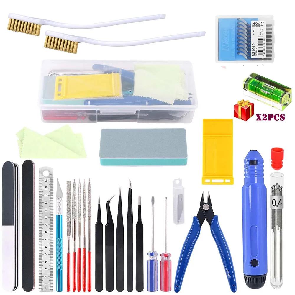 - Kit 5: An upgraded 24-piece model tool set featuring an electric grinder, 5 sharpening heads, a 15cm stainless steel ruler, 2 polishing files, 1 blue plier, 1 yellow model disassembly plate, 5 blades, 1 blue carving knife, 3 diamond files, 2 tweezers, 1 four-sided polishing block, 1 pink glasses cloth, and a plastic box.