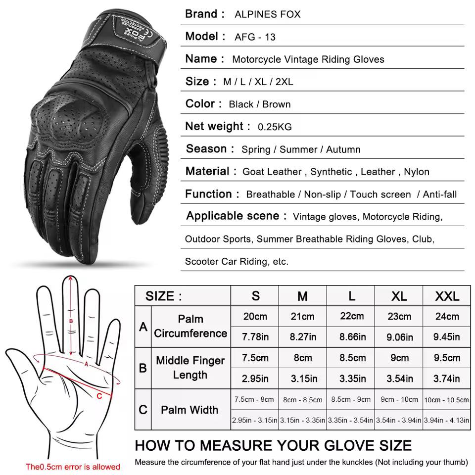 Ride with style and safety using these unisex motorcycle leather gloves. Available in black/brown or all-black with protectors, they are crafted from goat leather, synthetic leather, and nylon for durability and comfort. Featuring a touchscreen-compatible design, knuckle protection, and breathable materials with air vents, they are perfect for spring, summer, and autumn. Adjustable wrist straps ensure a secure fit for motocross, off-road, racing, and daily rides. Sizes available: M, L, XL, XXL. Trust the ALPINES FOX brand for superior riding gear.